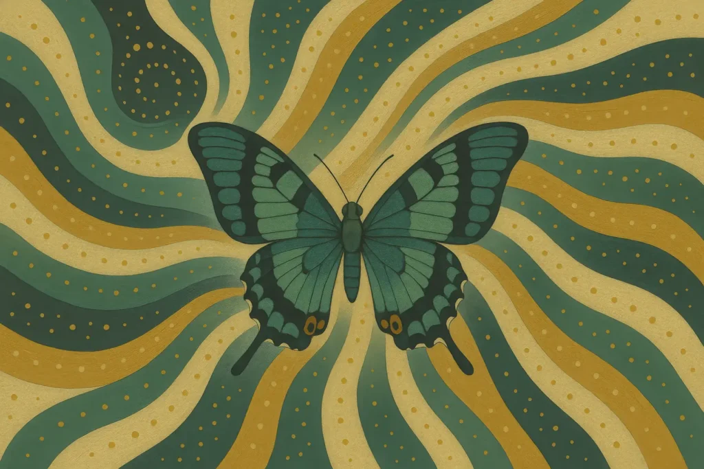 “The butterfly is a symbolic presence, inspired by the blue butterflies of the rainforest, representing transformation, continuity, and emergence.”